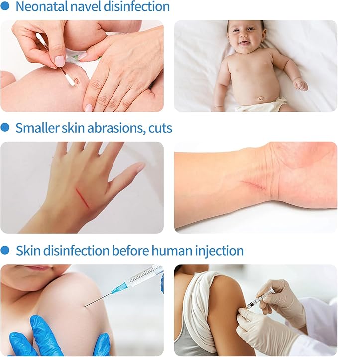 - Each iodine swab has skin-friendly cotton tips on both ends, is 8 cm long, and contains 0.15 ml of iodine solution. Adjust the number of swabs based on wound size as needed.