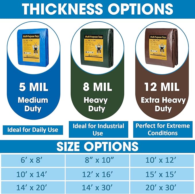 - Versatility in Use: Suitable for covering bikes, garden tools, or as a picnic mat. Available in multiple sizes, from 6x8 feet to 20x30 feet