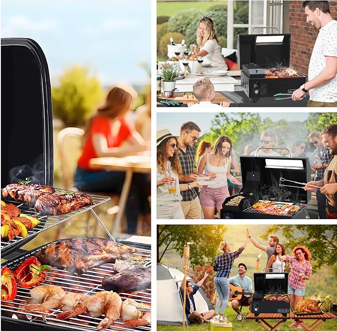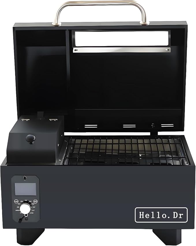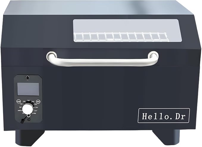 - 【Woodfire Technology】: Powered by electricity and flavored with real burning wood pellets, Hello.Dr portable electric smoker grill allows you to create a rich woodfire flavor that can be seen and tasted in any cook function. Super easy cooking even for beginners.