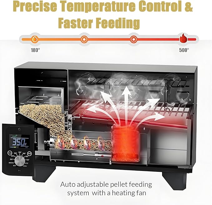 - 【Intelligent Temperature Control】: Digital temperature control automatically adds pellets as needed to regulate the temperature. The advanced pellet feed technology for efficient heating. Temperature control knob for 180°F-500°F temperature adjustment (smoke, low, medium high).Metal plates allow an electric smoker to heat up faster and hold more heat. It heated up very quickly, the temperature was pretty steady for a portable pellet grill smoker.