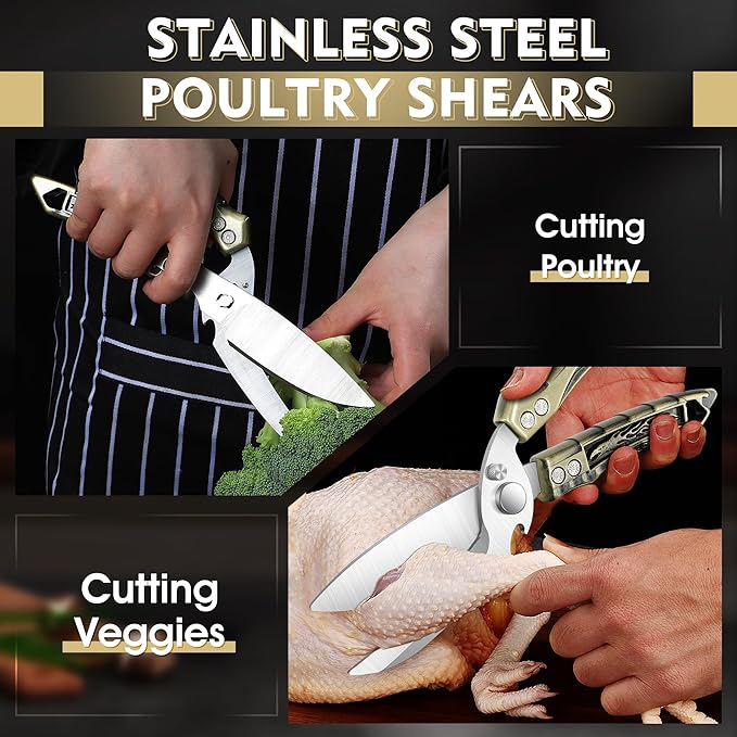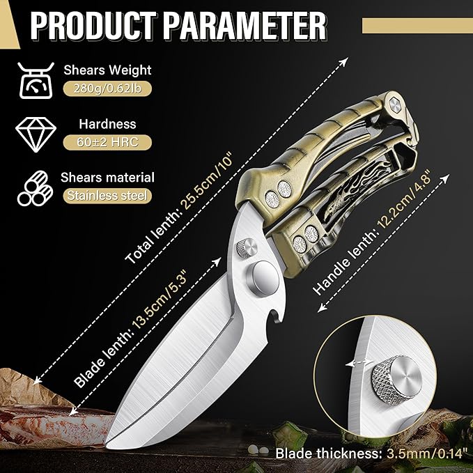 - VERSATILE & Durable - The heavy duty Versatile Kitchen Cooking Scissors can perfectly complete lots of tough kitchen tasks, such as cutting poultry, bone, seafood, raw meat, chicken, poultry, turkey, vegetables, spiral shell and so on. Best cutting effects with minimal effort. They’re also perfect for BBQ, Camping, Hiking, and other outdoor activities. It is a must-have tool to your kitchen or restaurant.