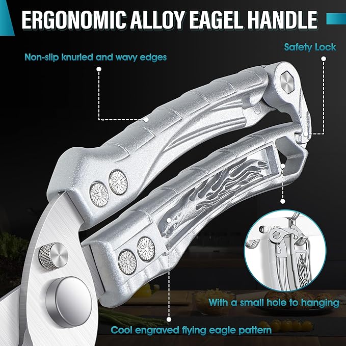 - ERGONOMIC FLYING EAGLE HANDLE - The pretty silver alloy handle with a cool flying eagle pattern design will never fade and rust. The four rivets hold the handle and the blades firmly. The Nonslip wavy edge creates a safe and comfortable grip, they won’t slip out of your hands while you’re using them. The hanging hole on the tail helps you save room, and store it.