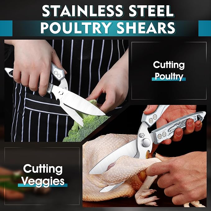 - VERSATILE & Durable - The heavy duty Versatile Kitchen Cooking Scissors can perfectly complete lots of tough kitchen tasks, such as cutting poultry, bone, seafood, raw meat, chicken, poultry, turkey, vegetables, spiral shell and so on. Best cutting effects with minimal effort. They’re also perfect for BBQ, Camping, Hiking, and other outdoor activities. It is a must-have tool to your kitchen or restaurant.