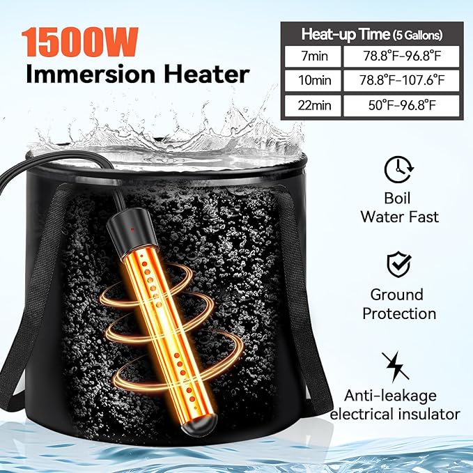 - 【1500W Immersion Heater】Our portable shower comes with a 1500W high-power immersion heater for you to enjoy warm water baths. Just plug the heater to a wall plug or power generator and watch the water heat up in a matter of minutes.Our portable water heater comes with one digital thermometer for real-time monitoring of the water temperature. Wherever you go, you can enjoy fast and reliable hot water!
