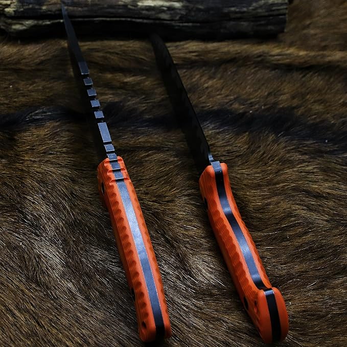 BA-KOR 12.4in Full Tang Fixed Blade Hunting Knife โ 6mm 9CR18MoV Steel, G10 Handle, Stonewashed Sawback Blade with Kydex Sheath & Fire Starter for Outdoor, Camping, Survival (Orange with light yellow stripes)