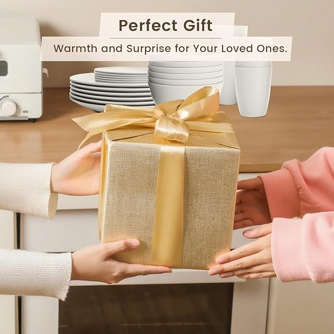 - GIFT FOR YOUR LOVED ONES: Our unique pattern design, smooth round edges, and classic white color design will impress your guests and elevate your dining experience. Each dish set includes 10'' dinner plates, 6'' wheat straw plates, 26 oz cereal bowls, and 12 oz cups, all beautifully packaged in gift boxes. Perfect for weddings, Christmas, housewarmings, and more, this reusable dinnerware set is a versatile and elegant choice.
