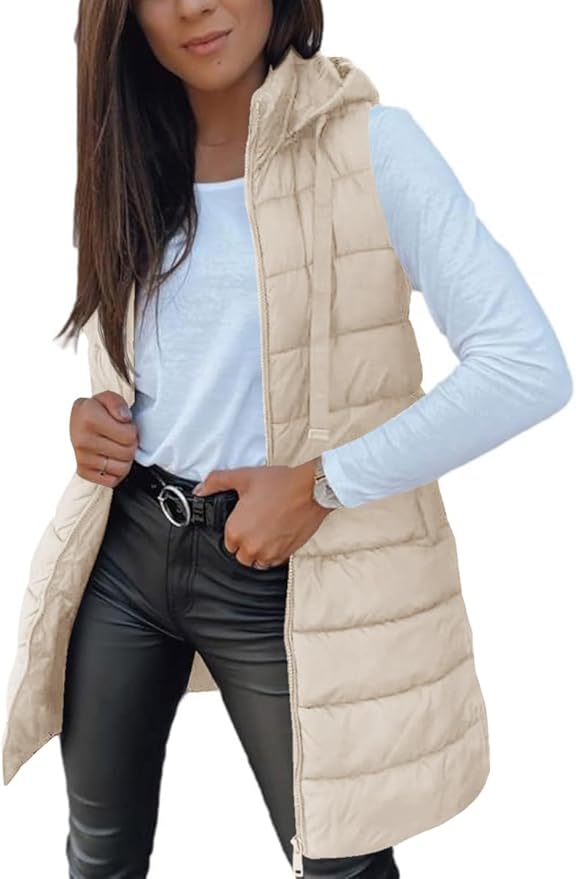 Veatzaer Women Long Vest Solid Color Sleeveless Hood Winter Puffer Vest Outwear