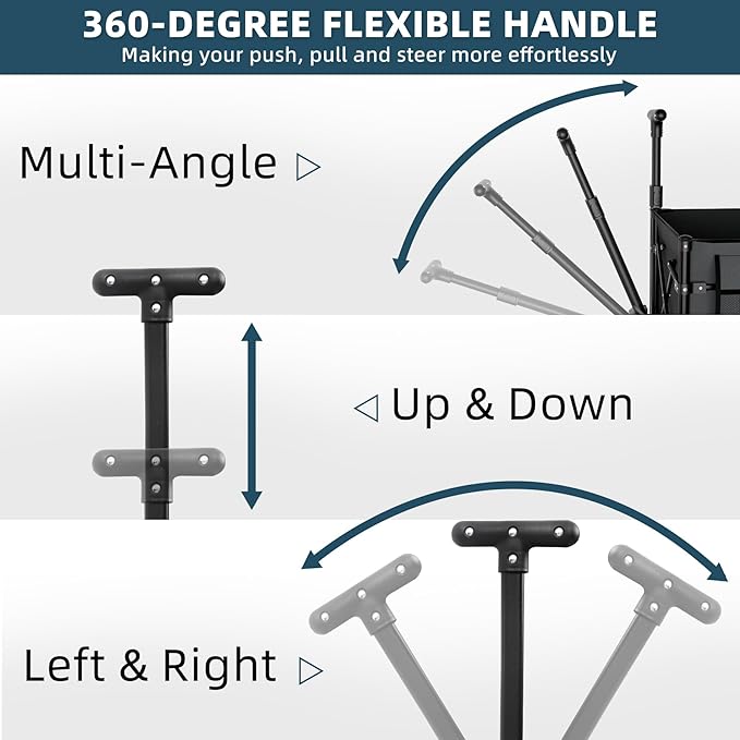 - Wide All-Terrain Wheels with Brake & Adjustable Handle - The folding wagon equipped with two front 360° rotating off-road wheels with brakes, ensuring a smooth pull and easy transport on most kinds of ground surfaces like the cobbled road, asphalt, dust, and grass. The functional handle can be easily adjusted into any angle you preferred, and 22.5'' -34'' height range is suitable for different users, to your push and pull more effortlessly.