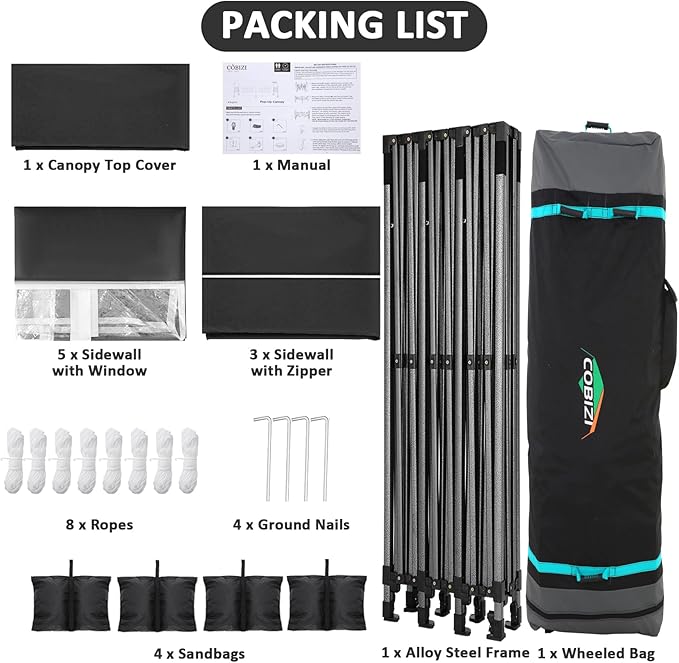 COBIZI 10x30 Pop Up Canopy with 8 Sidewall,Heavy Duty UPF 50+ All Season Wind Waterproof Commercial Outdoor Wedding Party Tents for Parties Canopy Gazebo with Roller Bag(10 x 30 ft Black)