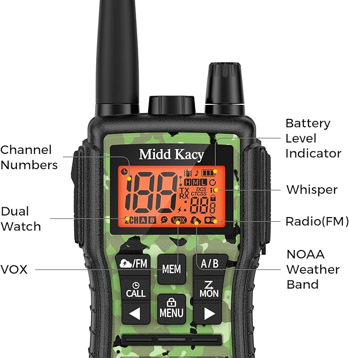 Midd Kacy MK208 Camo Walkie Talkie - Long Range walkie talkies - 61 Channels Gmrs Handheld Radio -121 Privacy Codes,New Flashlight,SOS Siren,NOAA Weather Alerts & Scan - Camouflage,2 Pack