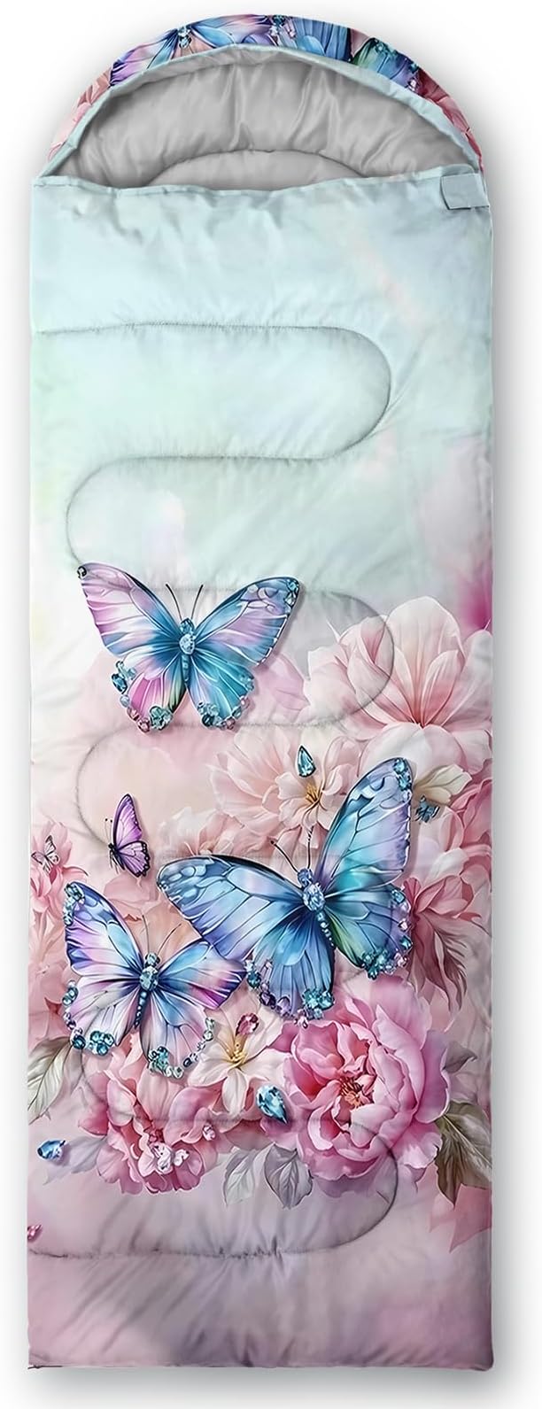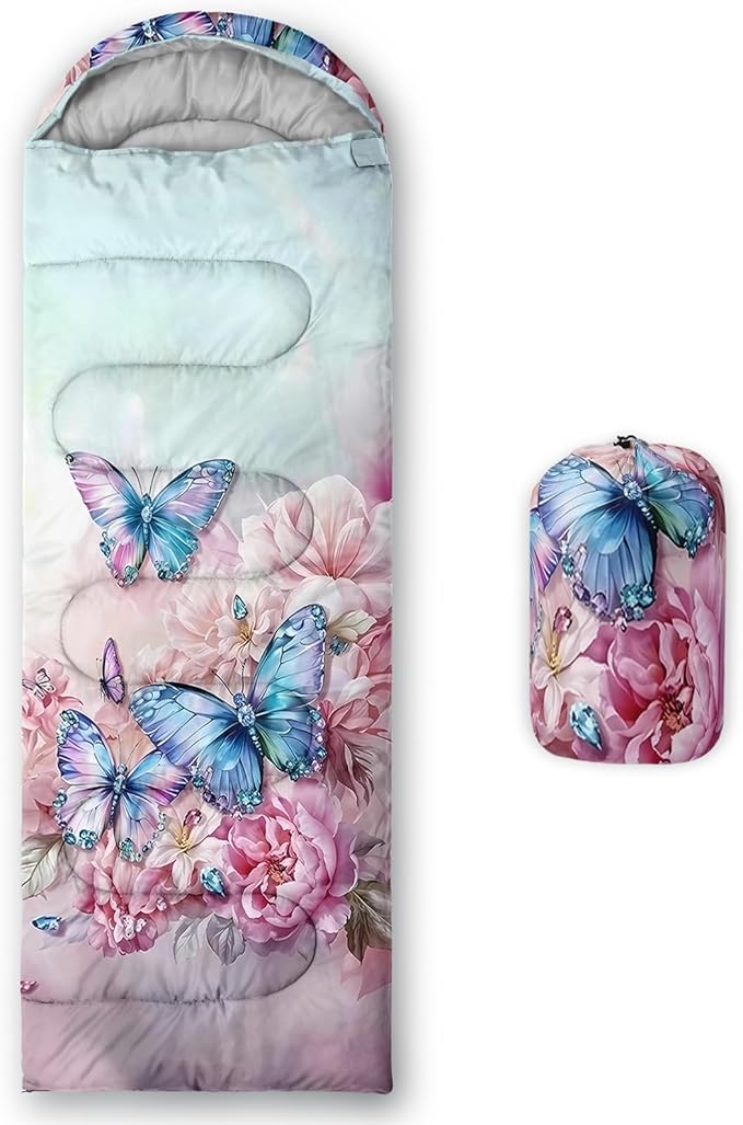 - 【Fits For 3 Seasons】: Size - 31 by 90 inches (W x D). Our pink butterfly sleeping bag can be used in 3 seasons with a design temperature of 32℉-77℉(0℃-25℃). These Sleeping bags also have a weather resistant waterproof design to keep you warm and prevent you from any dampness.