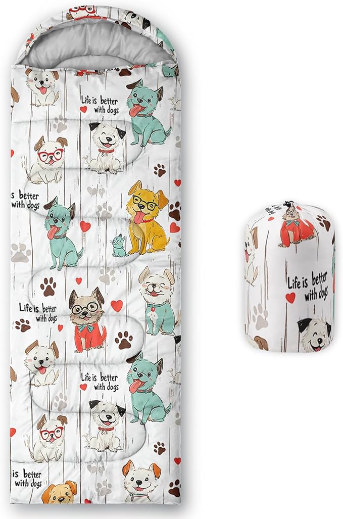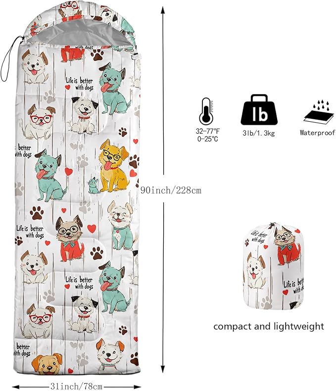 - 【Fits For 3 Seasons】: Size - 31 by 90 inches (W x D). Our cute puppy dog sleeping bag can be used in 3 seasons with a design temperature of 32℉-77℉(0℃-25℃). These Sleeping bags also have a weather resistant waterproof design to keep you warm and prevent you from any dampness.