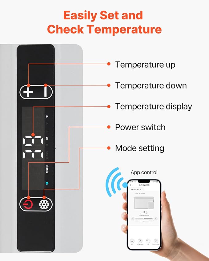 - -4 ~ 68°F Temperature Range: The car refrigerator features an expanded temperature range of -4 ~ 68°F, allowing for both freezing (-4 ~ 32°F) and refrigeration (32 ~ 68°F). You can easily adjust the temperature according to your food storage needs
