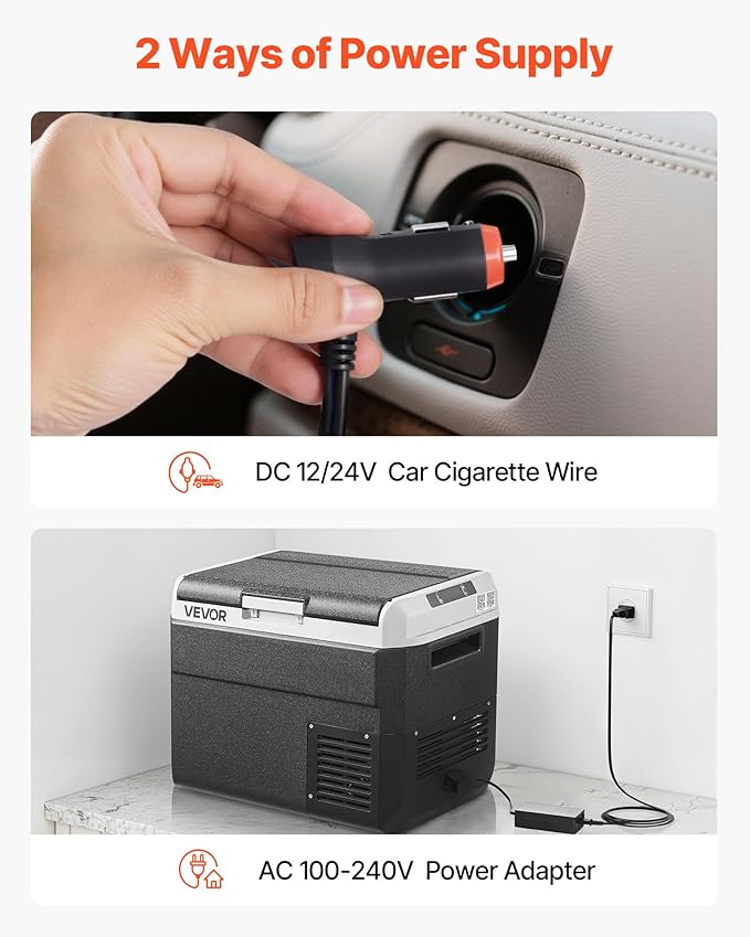- Dual Use for Home and Car: The portable refrigerator is equipped with an AC 100-240V power cord, DC 12/24V car cigarette wire, and adapter, allowing easy connection to your car/RV’s cigarette lighter port, household outlets, and other power sources