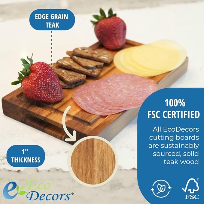 EcoDecors, Teak Cutting Board 10"x6", Reversible Compact Teak Wood Edge Grain Cutting Board with Juice Groove, Small Wooden Board for Bar, Garnish, Snack, Cheese, or Gift, FSC Certified
