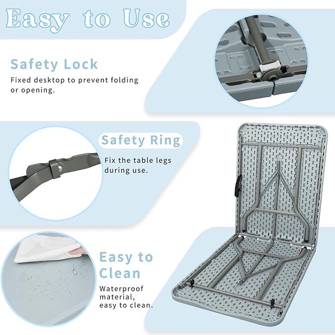 - Easy to Use: This picnic table can be used directly without assembly, simply open or fold the table legs to easily complete the installation or folding of the table. The built-in safety lock of the folding table can secure the table from folding or opening.