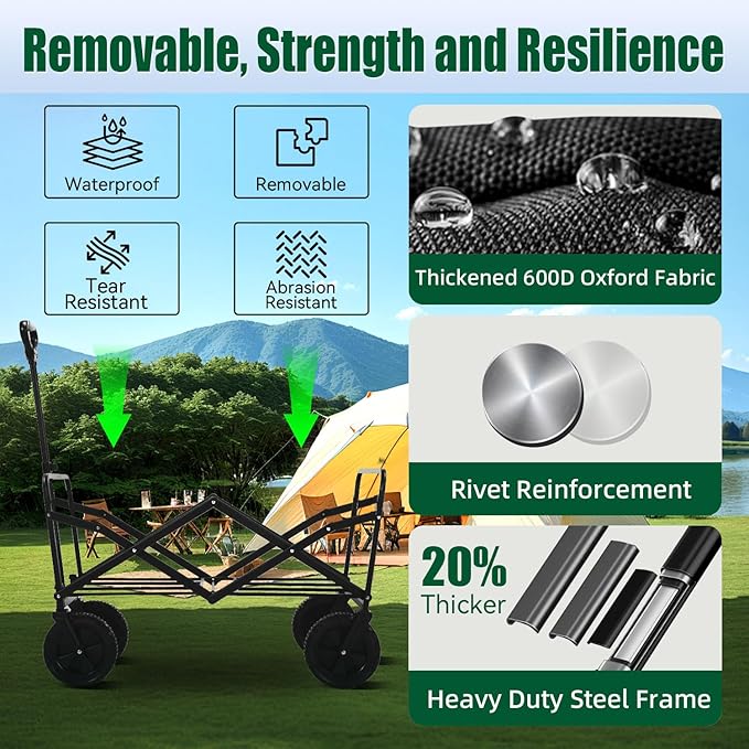 - 【Detachable Fabric Grocery Cart】: The beach cart is constructed from 600D Oxford cloth, which offers excellent waterproof properties, as well as resistance to wear and tear. The fabric cover can be easily removed within seconds, making it highly convenient for cleaning and maintenance