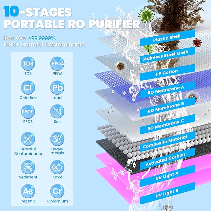 - 💧EMERGENCY WATER FILTRATION: The Purewell K8680 electric water purification system uses a 0.0001 micron RO membrane and is equipped with a dual system UV lamp. It can reduce up to 99.999% of TDS, PFOA, PFOS, fluorine, arsenic, chlorine, lead, most heavy metals, odors, chemicals and other trace substances. It has passed SGS and NSF/ANSI international laboratory tests, and the materials comply with FDA food-grade standards. Even in the wild, it can ensure healthy drinking water!