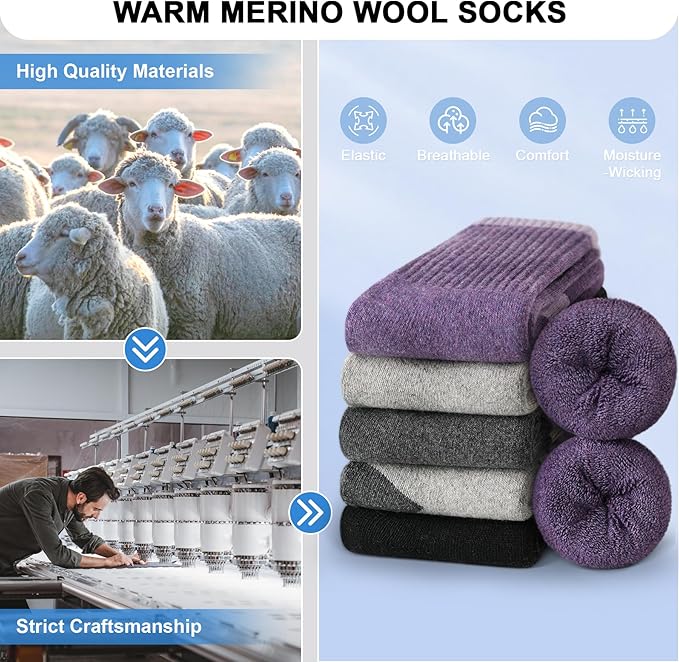 - [ MERINO WOOL MATERIAL ] Merino Wool socks for women are crafted from 60% merino wool, 25% polyester, 10% cotton, and 5% elastane, providing luxurious softness and breathability. They wick away moisture to keep feet dry and comfortable all day, with high elasticity ensuring a perfect fit for most foot sizes without being too tight.