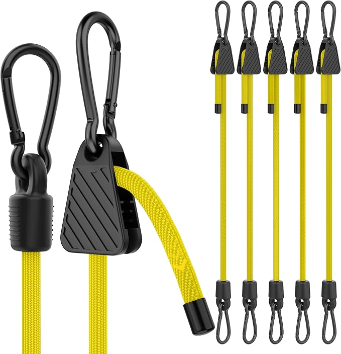 - Easy to Adjust Design Bungee Cords: Easily adjustable from 7 inches to 60 inches, these yellow bungee cords offer unmatched flexibility for securing your cargo. Whether you're tying down gear for a road trip, outdoor adventure, or everyday use, you can quickly customize the length to meet your specific needs. No more hassle with small bungee cords that are too long or too short—adjust freely for the perfect fit every time.