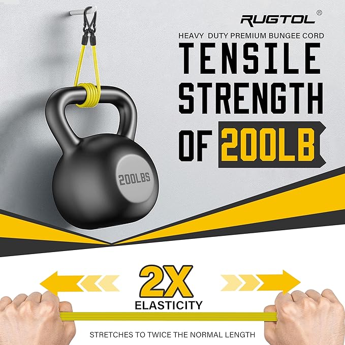 - Super Elasticity and Durability Bungee Cords: Rugtol adjustable heavy-duty outdoor bungee cords are made from a UV-resistant, high-quality Thai latex and cross-woven rubber blend, offering superior elasticity that stretches up to 1.7x to 2x its original size. Unlike ordinary rubber bungee cords with hooks, these bungee cords maintain flexibility without becoming thin or brittle. The rust-resistant carabiner hooks are made with advanced electrophoretic coating technology.