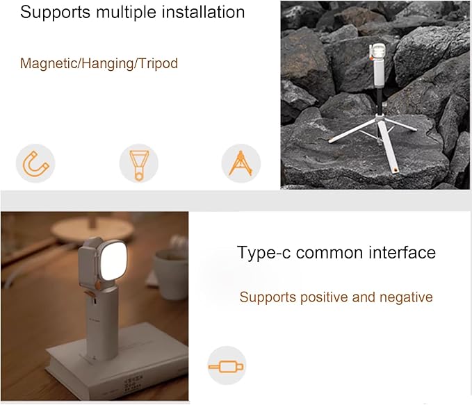 - Supports multiple installation methods including magnetic attachment, hanging, and tripod mounting. You can easily fix it on metal surfaces, hang it in the tent, or set it up on a tripod for stable lighting