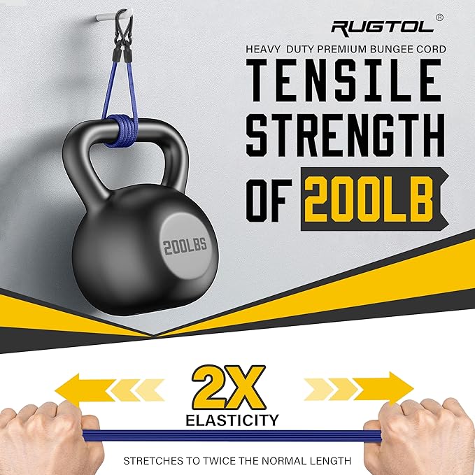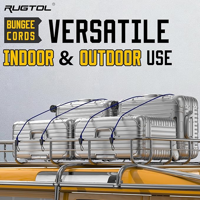 - Super Elasticity and Durability Bungee Cords: Rugtol adjustable heavy-duty outdoor bungee cords are made from a UV-resistant, high-quality Thai latex and cross-woven rubber blend, offering superior elasticity that stretches up to 1.7x to 2x its original size. Unlike ordinary rubber bungee cords with hooks, these bungee cords maintain flexibility without becoming thin or brittle. The rust-resistant carabiner hooks are made with advanced electrophoretic coating technology.