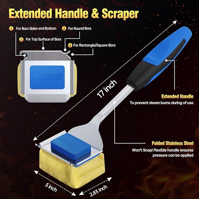 - 【Easy to Clean and Reusable】Preheat grill to over 400 degrees Fahrenheit and then turn off all burners for your safety.Then clean the grill after brush head soaking it in water, remove cold buildup on the grill with a stainless steel scraper, Use a sponge pad to scrub thoroughly. The powerful cleaning power of steam makes it easy to dissolve grease and stains