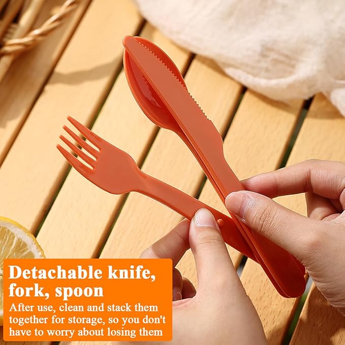 - 2. Innovative Interlocking Design:Designed for convenience, the fork, spoon, and knife clip together firmly, preventing them from rattling or getting lost. This smart design ensures easy access and organized storage during camping, hiking, or picnics.