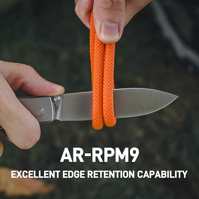 - AR-RPM9 Steel Blade: This pocket knife features a 3.54-inch AR-RPM9 steel blade. The blade is sand polished, flat blade grind and has a hardness of HRC59-61 for durability and razor sharpness