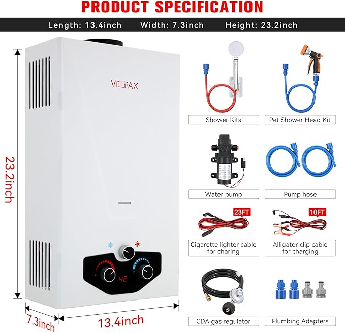 - 【Complete Accessories】 - This tankless water heater comes with a CSA-approved 5FT gas regulator and a high-pressure shower head with 5 spray modes. Also included are a 8 spray pet showerhead, a 2GPM water pump with dual power options (10ft alligator clip cable and 23ft cigarette lighter cable), 4 pipe adapters, and 2 hoses. The dual power options for the water pump allow for flexible charging and usage, whether you're near a vehicle or using a battery setup.