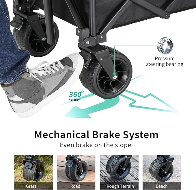 - 【All-Terrain Tires for Any Surface】:Our beach wagon rolls smoothly with 7" knobby tires (all with bearings + front-wheel brakes) to conquer sand, trails, or rocky campsites. Anti-slip treads and braking keep you safe on hills.