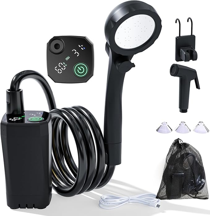 Portable Shower for Camping, 6000mAh Rechargeable Camping Shower Pump with Power & Temperature Display, Shower Head and Bidet Sprayer,Outdoor Shower Pump for Hiking, Travel, Pet