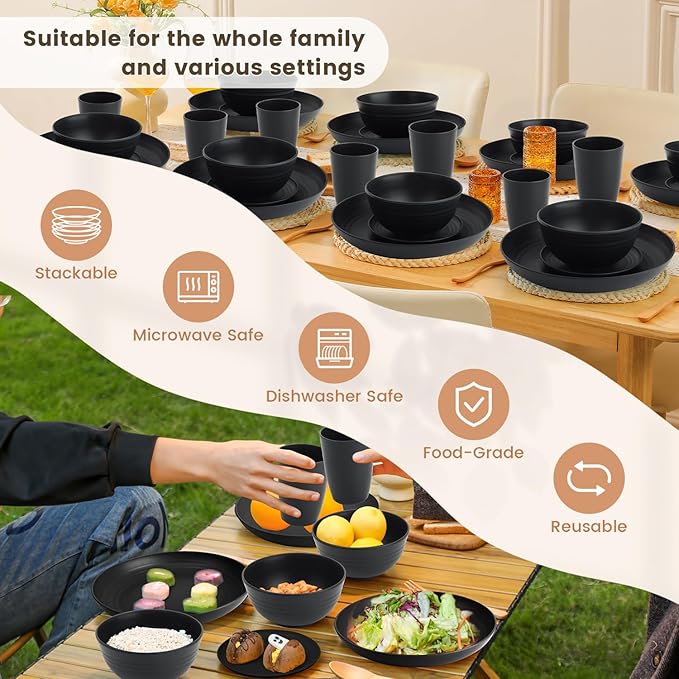 - HEALTHY WHEAT STRAW MATERIAL: Our plates and bowls sets are crafted from premium natural wheat straw and food-grade PP. It's non-toxic, free from harmful substances, and ensures safety for you and your family – making it the ideal choice for nature lovers.Perfect dinnerware sets for 8 – ideal apartment essentials or RV essentials.