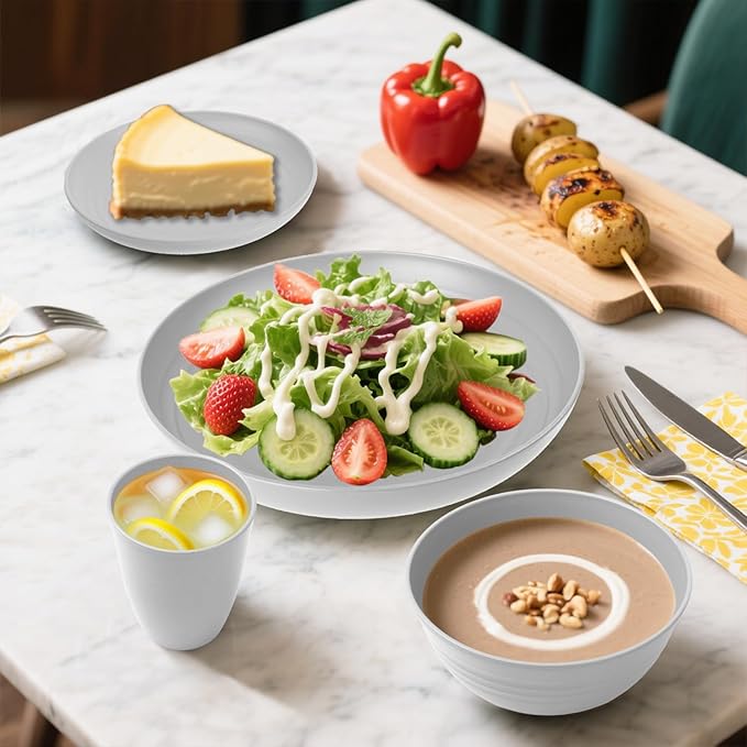 - 8-PERSON DINNERWARE SET: This 32PCS gray wheat straw dinnerware sets serve 8, including everything needed for daily meals: 8 dinner plates(10"), 8 dessert plates(6"), 8 cereal bowls(26 oz), and 8 drinking cups(12 oz). A dependable choice for everyday home use or serving guests