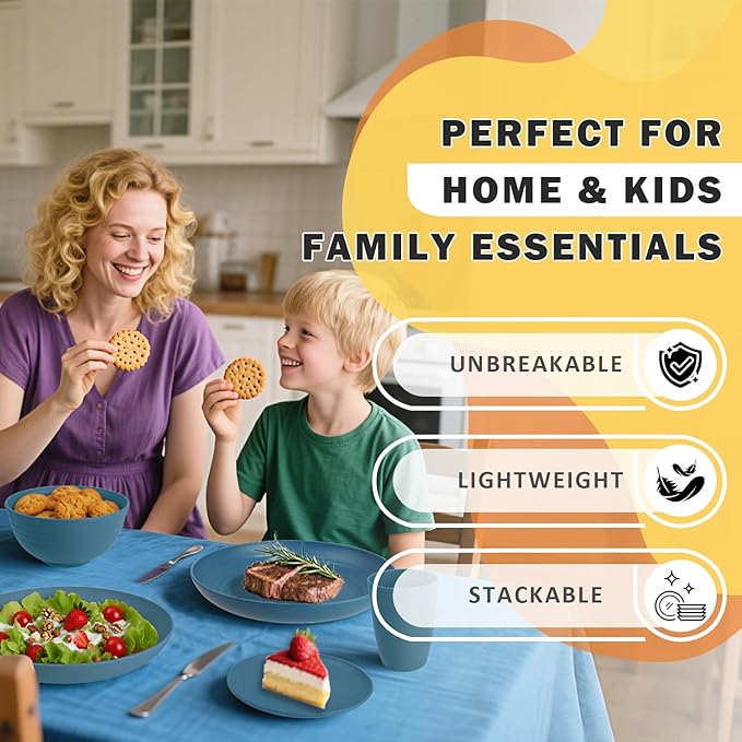 - LIGHTWEIGHT & UNBREAKABLE: Made of a sturdy wheat straw blend, this dinnerware set is surprisingly lightweight - easier to carry than porcelain or glass, making it ideal for outdoor picnics, camping trips, or gathering mealtime. Don’t let the light feel fool you: these plates, bowls and cups are unbreakable, standing up to accidental drops, bumps, and daily use