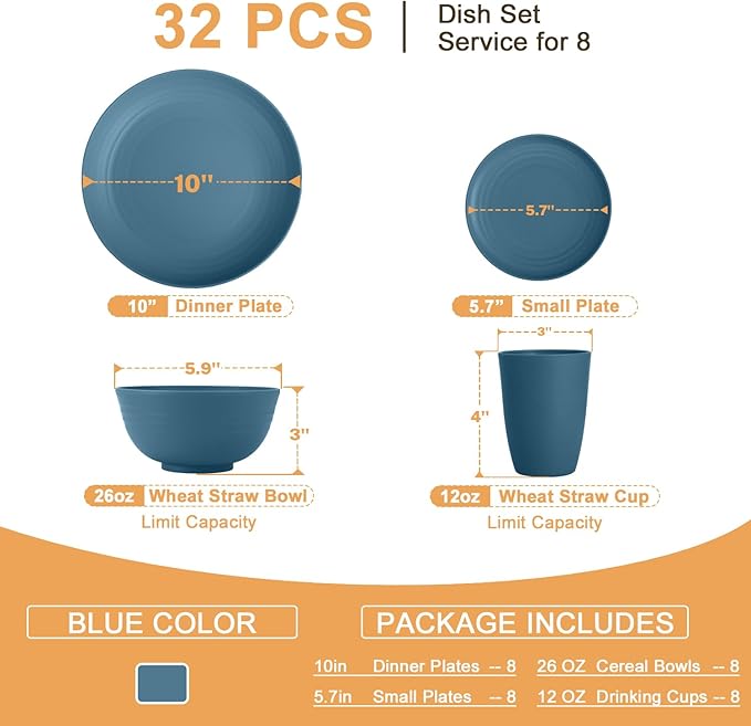 - PACKAGE INCLUDE: Still searching for the perfect dinnerware set to cover all your daily dining needs? Homienly 32-piece wheat straw dinnerware set includes: 8 deep plates (10-inch), 8 small dessert plates (6-inch), 8 cereal bowls (26 oz), and 8 drinking cups (12oz). It's perfect not only for everyday meals, but also for gatherings, parties, and camping!