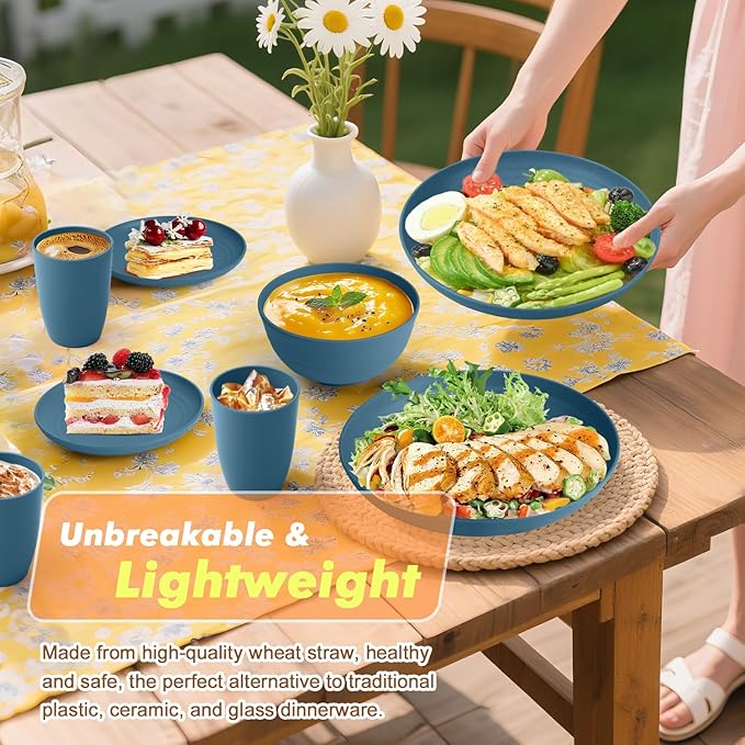 Homienly Wheat Straw Plates and Bowls Set, Premium Wheat Straw Dinnerware Sets- Dinner Plate, Dessert Plates, Cereal Bowls, Drinkig Glasses, Microwave and Dishwasher Safe Dish Set for Camping - Blue
