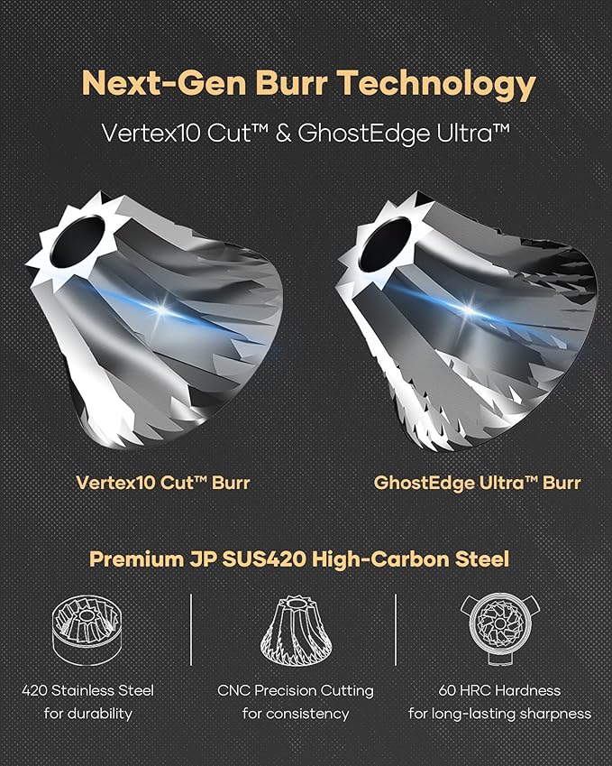- GhostEdge Ultra Burrs - Engineered with 120 micro-serrated teeth, our GhostEdge Ultra burrs extract unmatched clarity, sweetness, and body—because every great cup starts here