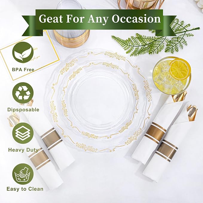 - Elegant Vintage Design: Features intricately embossed gold detailing on clear plastic plates rim and gold utensil handles, blending retro charm with modern simplicity. This sophisticated clear-and-gold palette elevates any occasion, from weddings and galas to casual gatherings.