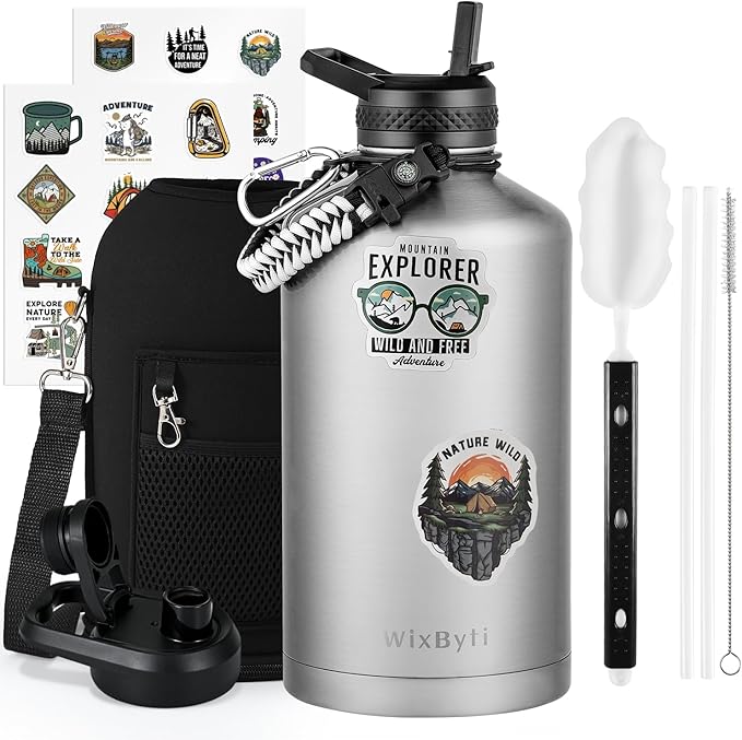 - After Services and Package: We offer continuous after-sales service against leakage and poor cold/hot-keeping capability, we are committed to 100% customer satisfaction. Your purchase includes: WixByti 64oz Water Bottle, Carrying Pouch with Adjustable Strap, Straw Lid with 2 Straws & 1 Straw Brush, Spout Lid, Paracord Handle, Water Bottle Stickers