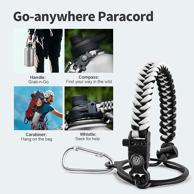 - Palm Fitting Paracord Handle: Compared to handle lids, nylon paracord on the bottle gives you more choices in terms of color coordination and coziness on your hands. Match the handle with your bottle to make a complete outdoorsy look. Compass and carabiner can be lifesavers for hiking and other expeditions
