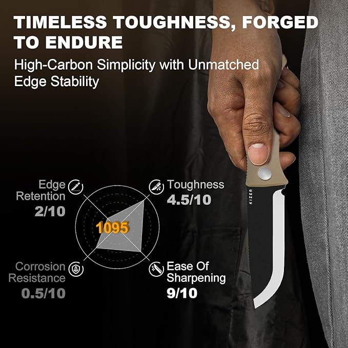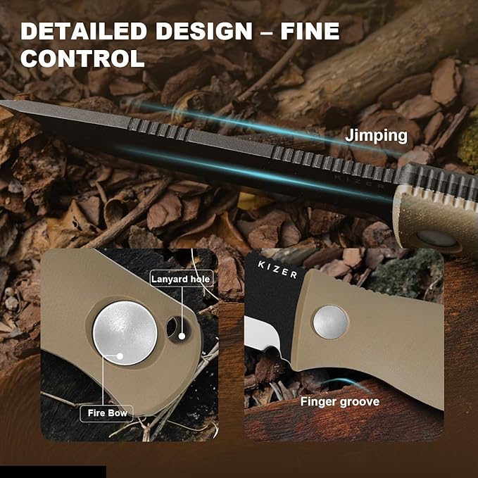 - Engineered for Grip, Built for Control: The Kizer Polaris fixed blade hunting knife features an ergonomic, spindle-shaped tan G10 handle; Its broad, contoured design ensures a secure, natural fit in the palm, making every cut precise and fatigue-free; Built for extended use, this survival knife offers lasting comfort and dependable reliability for prolonged tasks without compromise