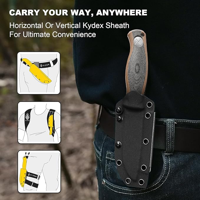 - Adjustable Kydex Sheath with Integrated Sharpener: The Kydex sheath of the horizontal carry knife offers adjustable tension and versatile mounting—horizontal or vertical—for a secure, adaptable fit in any environment; A built-in sharpener allows for quick touch-ups on the go, making it ideal for EDC, hunting, camping, and hiking