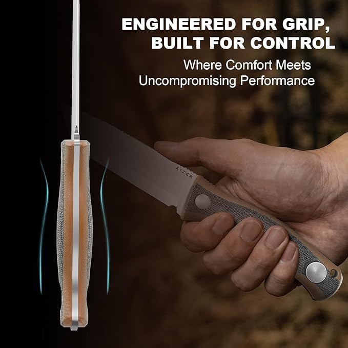 - Engineered for Grip, Built for Control: The Kizer Polaris fixed blade hunting knife features an ergonomic spindle-shaped handle combining black micarta and brown G10; Its broad, contoured design ensures a secure, natural fit in the palm, making every cut precise and fatigue-free; Built for extended use, this survival knife offers lasting comfort and dependable reliability for prolonged tasks without compromise
