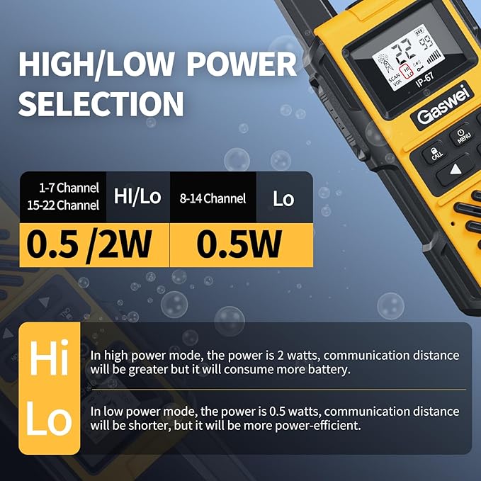 - 【Switchable high and low power】 Our walkie talkie can be switched between 0.5W (Lo) and 2W (Hi) RF output, meeting different usage requirements. Maximum communication distance of up to 6 miles (or 25 floors).(Frequency 8-14 It is low power; Frequency 1-7 and Frequency 15-22 indicate higher power, which means longer communication distance