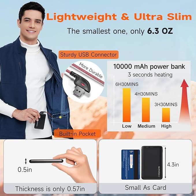 • [HIGH-CAPACITY 10,000mAh BATTERY PACK] :Comes with a certified 10,000mAh rechargeable battery pack with LED display. Lasts 3–6 hours depending on heat level, and includes a USB-C port to charge phones or other devices. Safety features include fire-resistant shell and temperature control protection, making it reliable for all-day use.