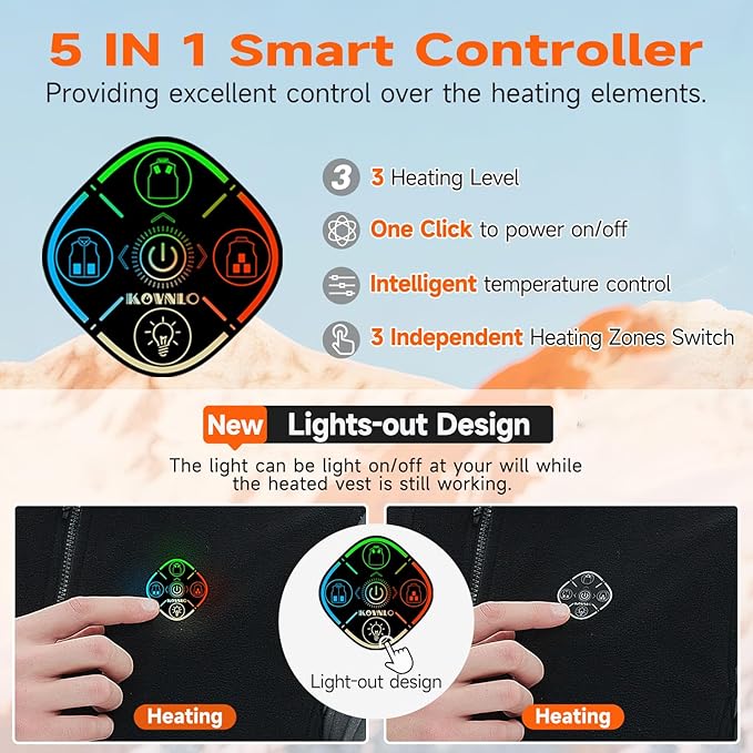 - [SMART 5-IN-1 BUTTON] :Customize your heat with 3 independent heating areas and 3 adjustable temperature levels (149°F / 131°F / 116°F). One-button operation is easy even with gloves on. A light-off function keeps the vest heating while turning off the glow—great for nighttime use, hunting, or discreet wear.