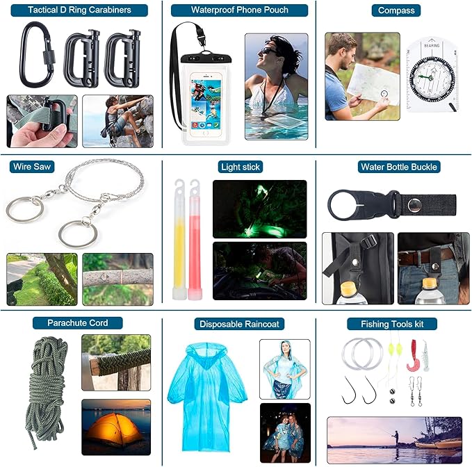 - 【Reliable & High Quality Survival Kits】The emergency preparedness kit contains must-having survival gear kit, likemultifultional axe, f0lding shovel, flashlight, pen, survival bracelet, emergency tent, fire starter.Covers diverse emergency needs like earthquake emergency kit, camping first aid, and doomsday prepping, serving as a reliable emergency backpack for 72-hour survival kit requirements.