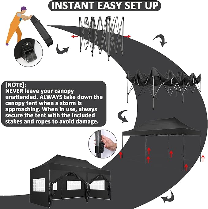 - 【6 Removable Sidewalls】The 6 side walls with PU coating are connected to the top of the frame and the legs by a whole piece of touch fastener for fixing, and are detachable, you 10 x 20 canopy tent heavy duty can install any number of side walls, which is convenient and practical. When in use, always secure the 10x20 pop up tent with the included stakes and ropes to avoid damage. One year after-sale protection for canopy frame; Six months after-sale protection for fabrics and accessories.